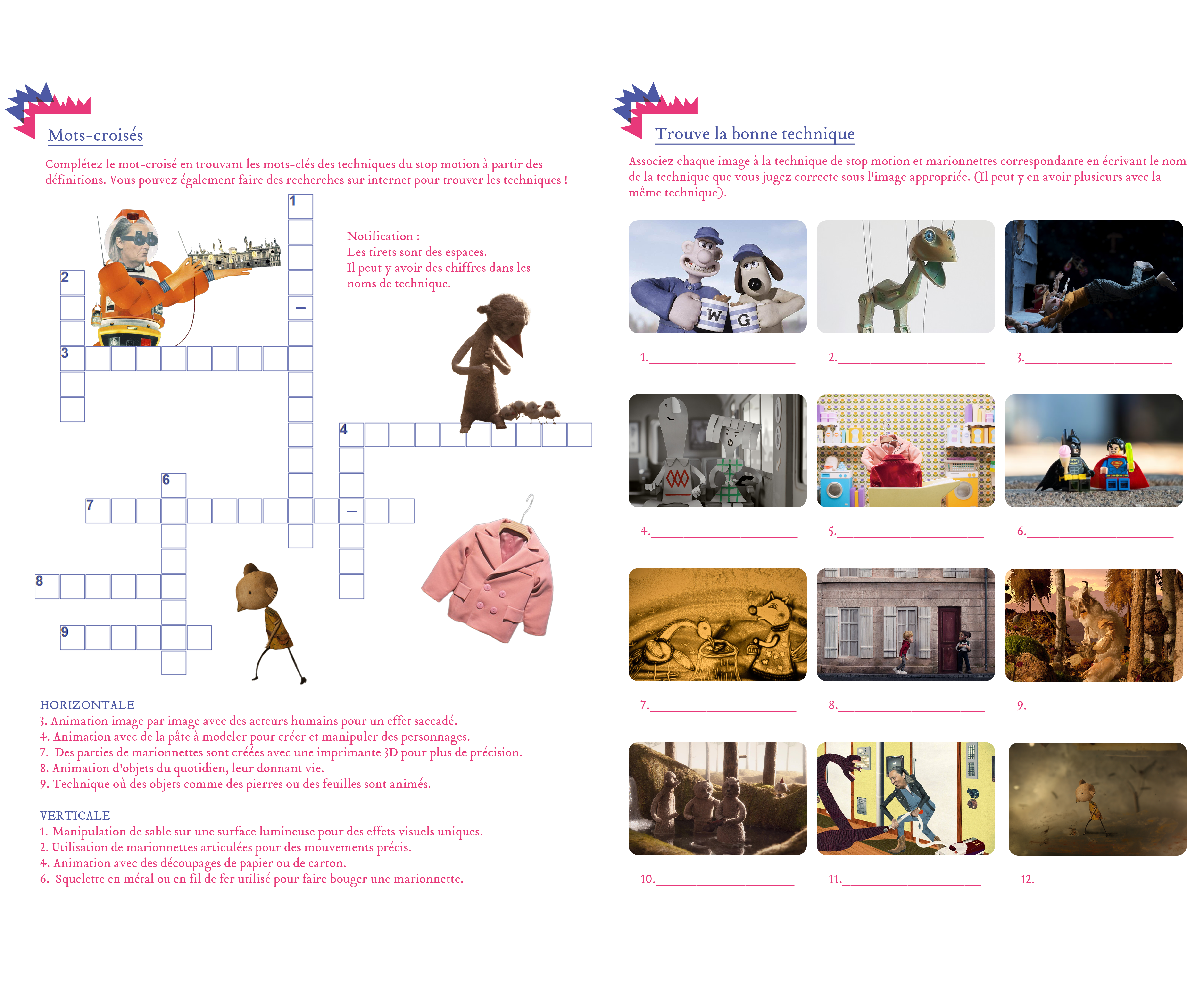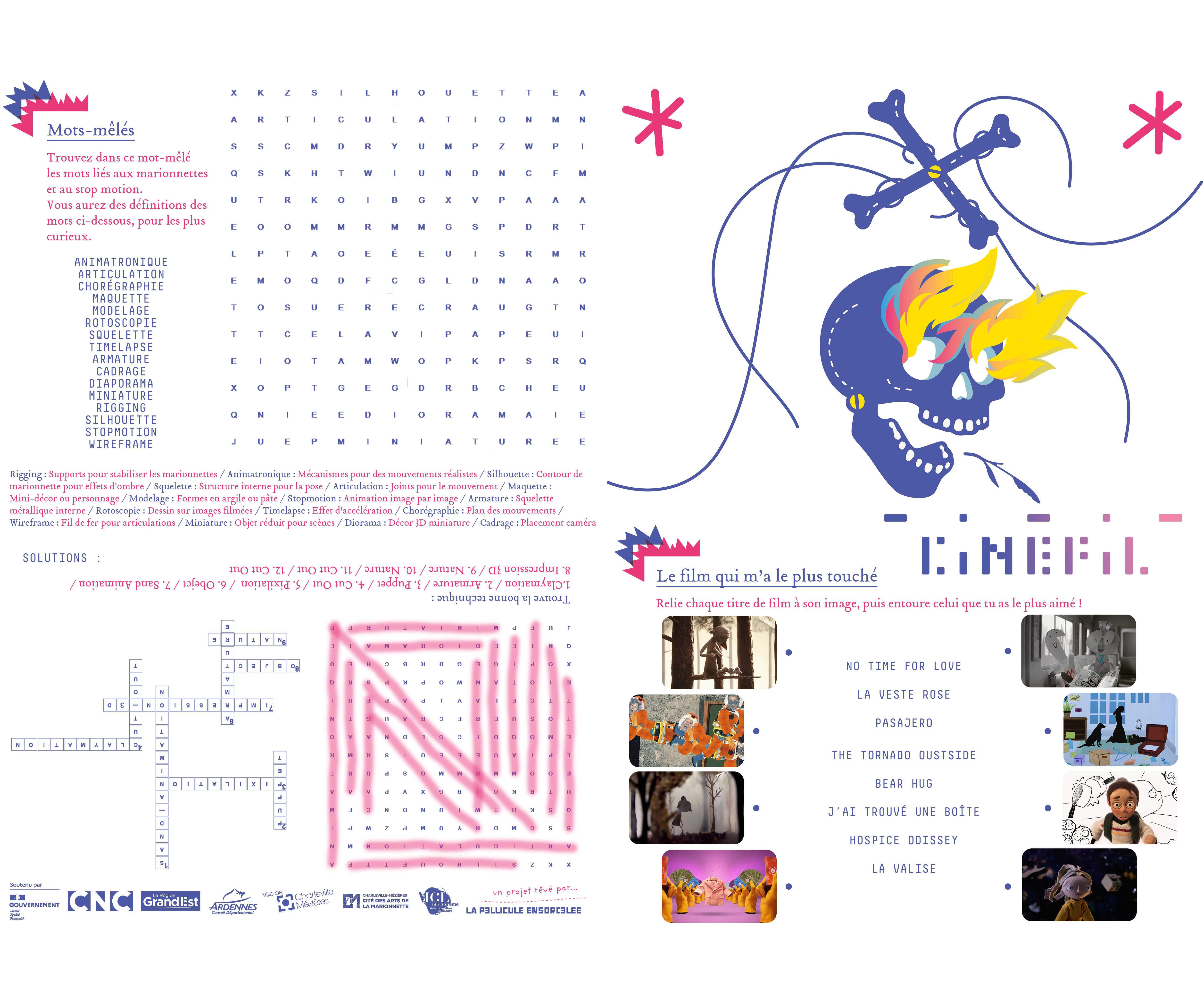 Après la fin de mon contrat, l’association La Pellicule Ensorcelée a de nouveau fait appel à moi pour concevoir, avec Photoshop, des feuillets de jeux à destination des collégiens dans le cadre de son événement Cinéfil. Ces supports ludiques visaient à prolonger l’expérience des projections à travers des activités pédagogiques et interactives.