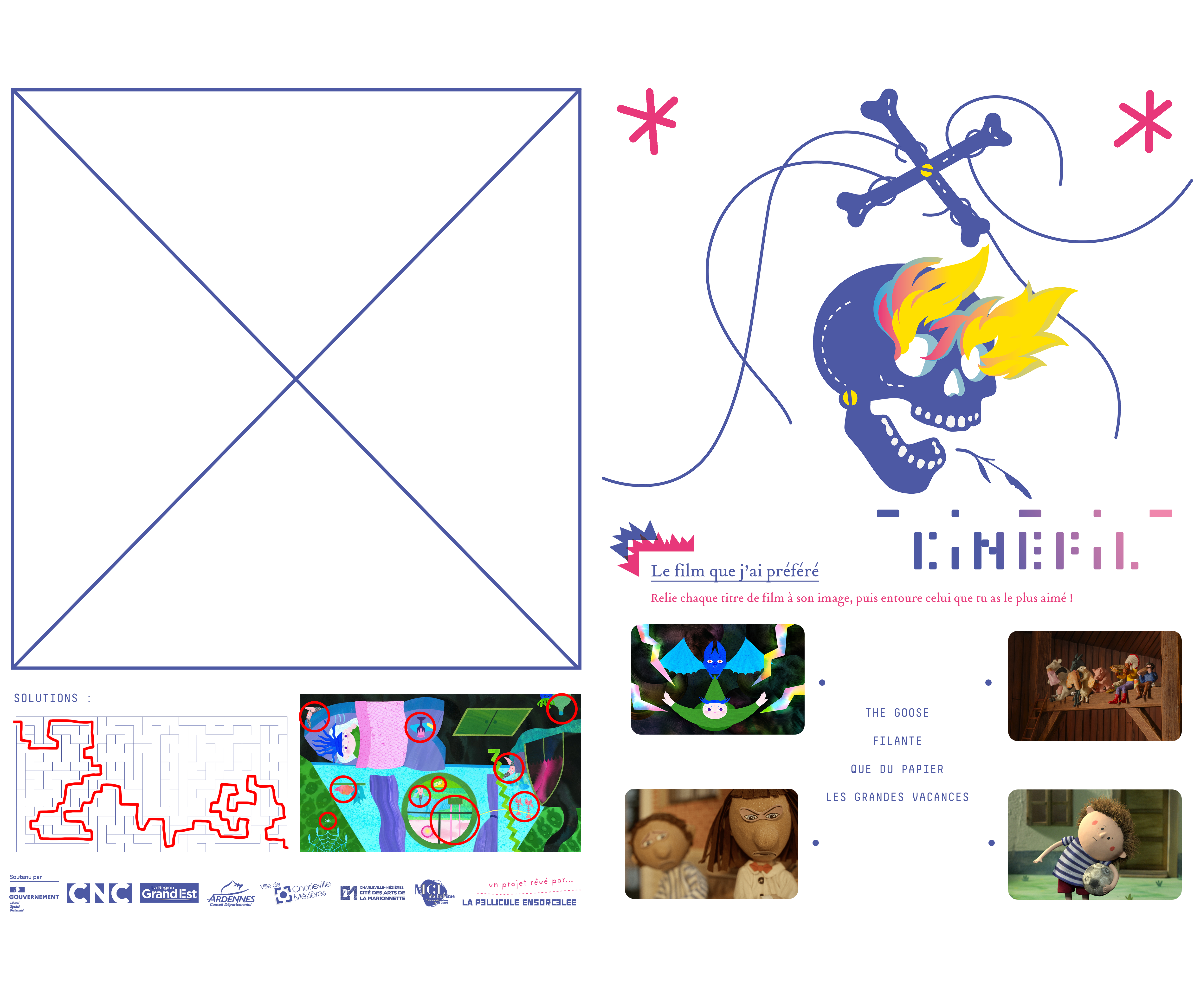 Après la fin de mon contrat, l’association La Pellicule Ensorcelée a de nouveau fait appel à moi pour concevoir, avec Photoshop, des feuillets de jeux à destination des élémentaires dans le cadre de son événement Cinéfil. Ces supports ludiques visaient à prolonger l’expérience des projections à travers des activités pédagogiques et interactives.