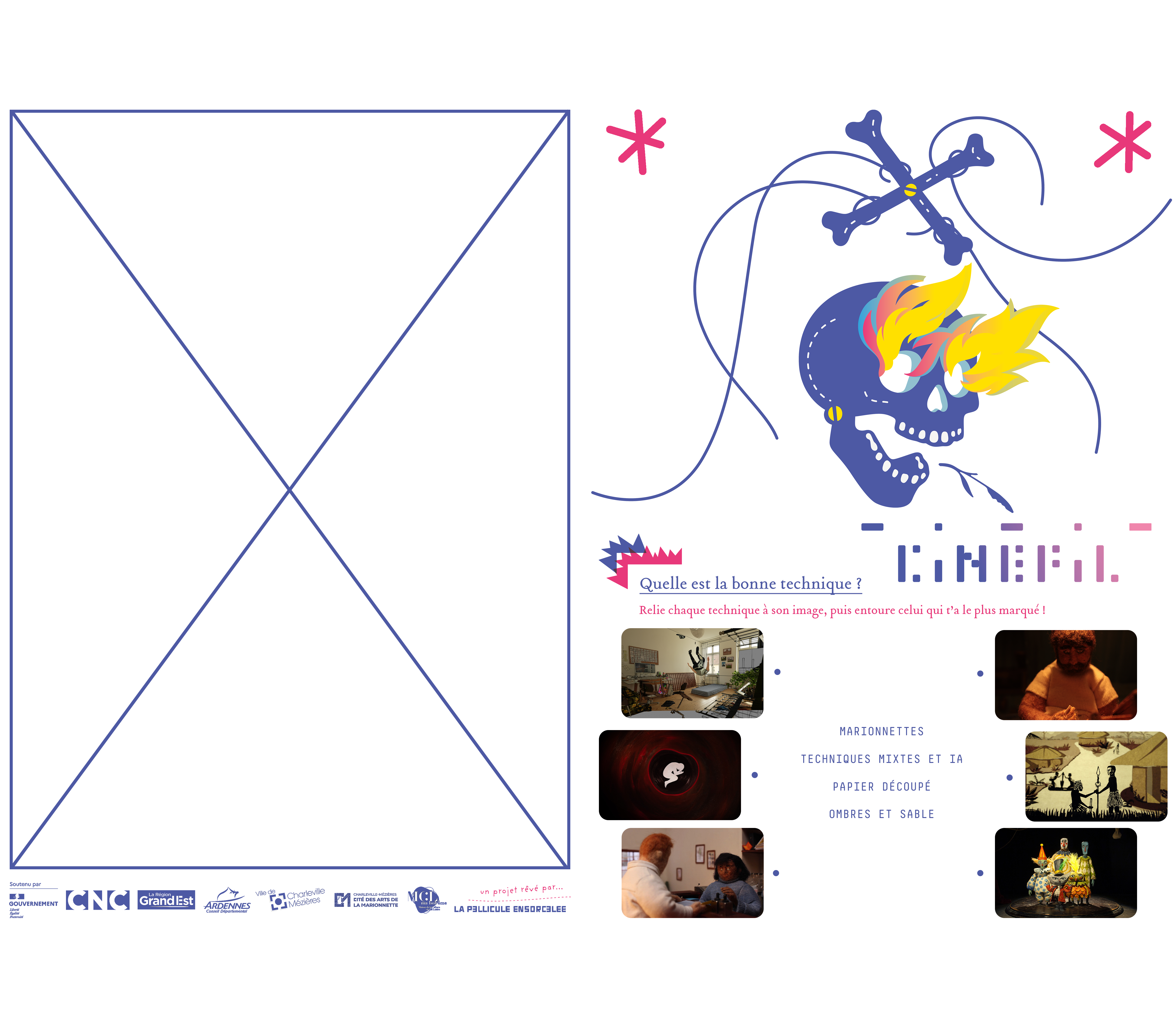 Après la fin de mon contrat, l’association La Pellicule Ensorcelée a de nouveau fait appel à moi pour concevoir, avec Photoshop, des feuillets de jeux à destination des lycéens dans le cadre de son événement Cinéfil. Ces supports ludiques visaient à prolonger l’expérience des projections à travers des activités pédagogiques et interactives.