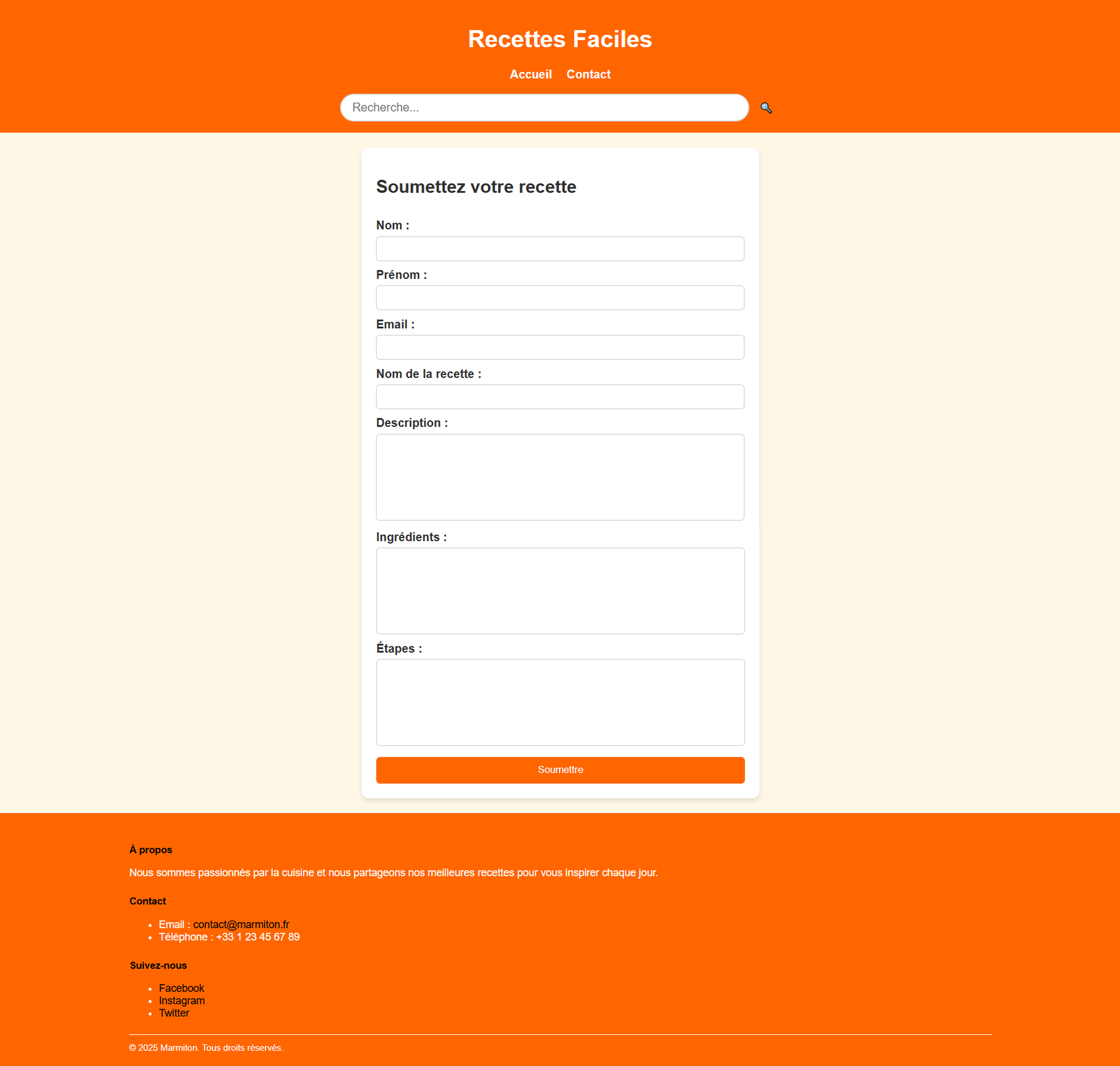 de recettes sous forme de cartes dynamiques, et une seconde page contenant un formulaire de contact permettant aux